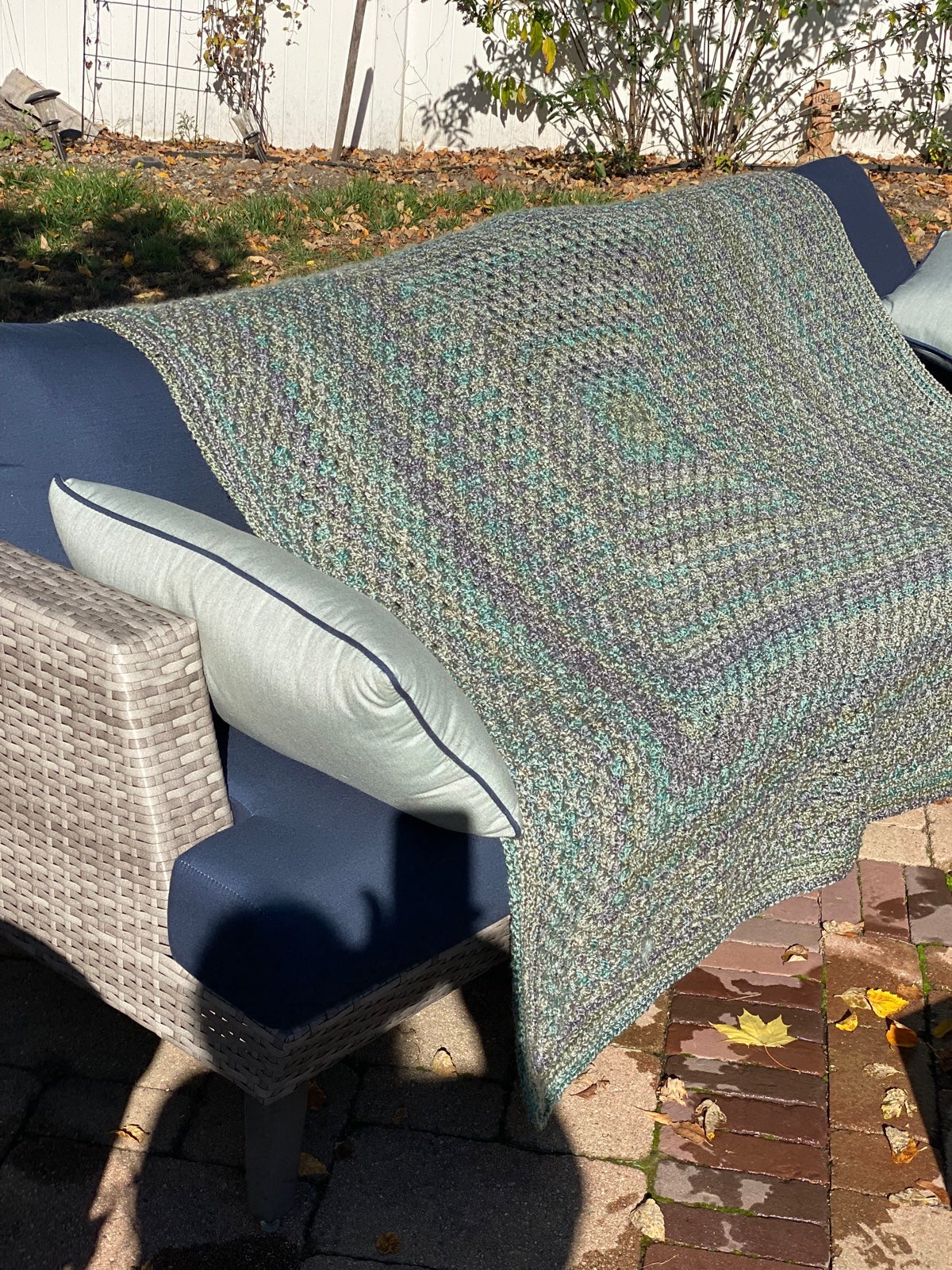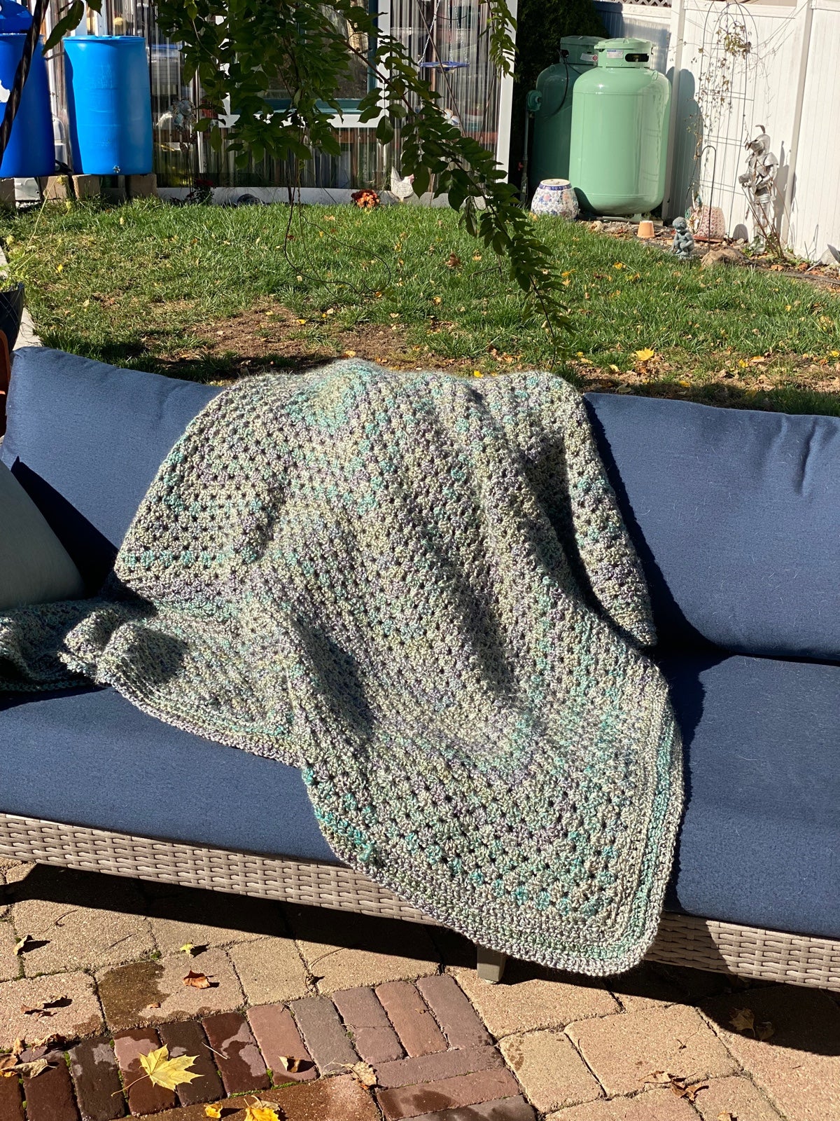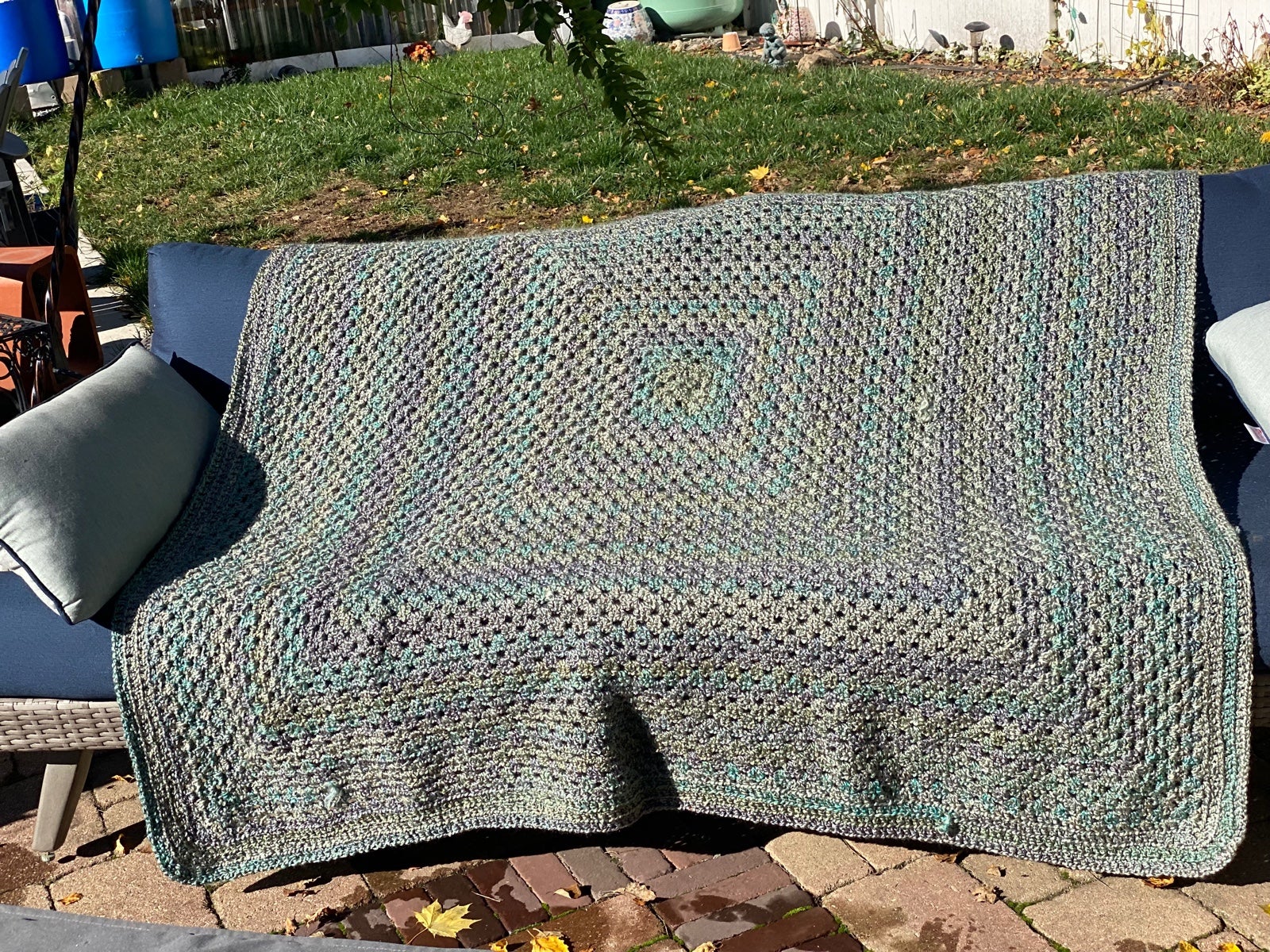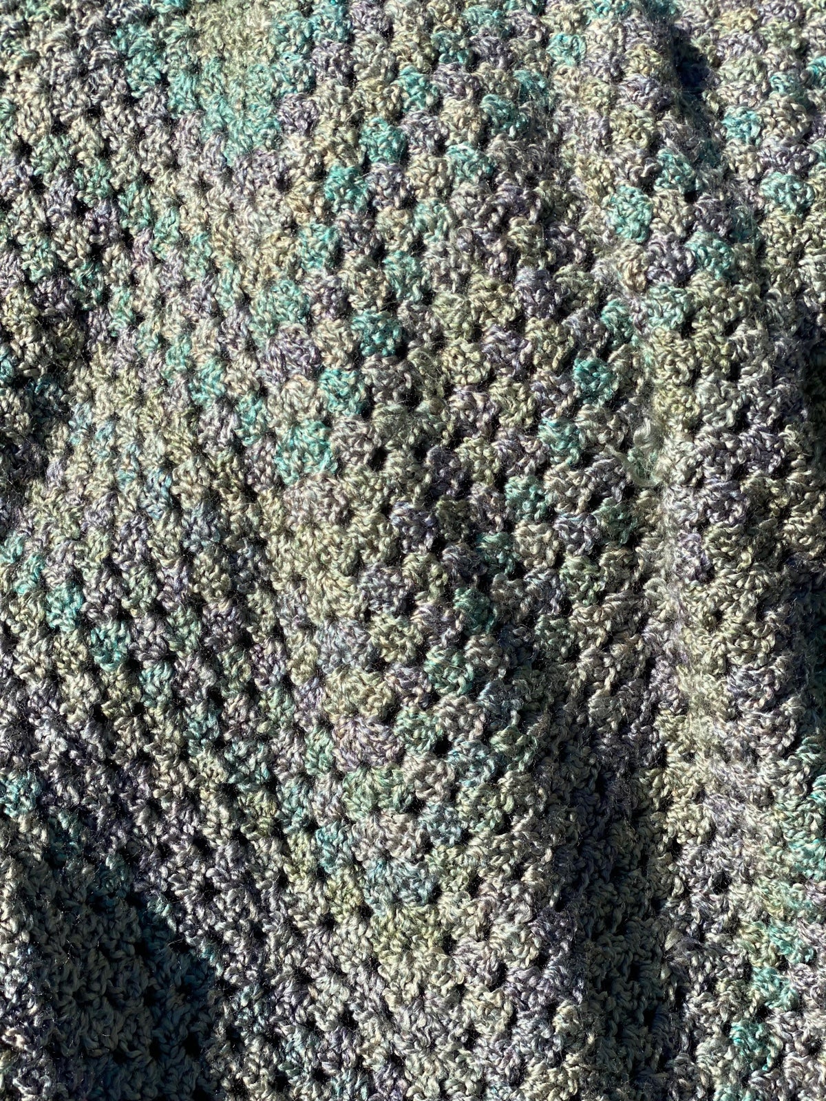 New beautiful handcrafted crochet afghan, and the granny square pattern, it measures 64” x 60 4 in.² and is considered a queen size this is an a variegated green color, it is made from lion brand home spun yarn it is very soft, it’s Composition is 98% acrylic with 2% polyester. Can be machine washed and dried on a low heat setting, please note boxed these are 5 pounds. is